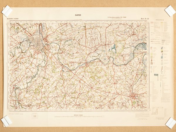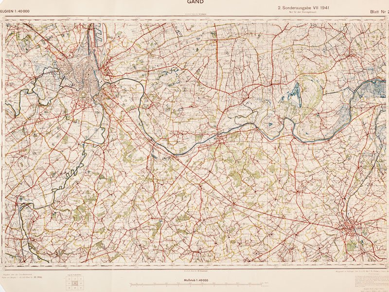 Map size 72 x 99 cm, 1/40.000, Hergestellt im Auftrage Gen. St. d. H. Abt. f. Kr. Karten u. Verm. Wesen II, VII 1941 Fine original map, used by the german military forces (Wehrmacht or Luftwaffe) during World War II. Très bon état pour cette belle grande carte d'état-major couvrant toute la région de Gand, en Belgique, et exclusivement réservée à l'usage des troupes militaires allemandes lors de la Seconde Guerre Mondiale. Les couleurs sont parfaitement conservées.