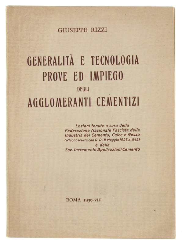 GENERALITA' E TECNOLOGIA - PROVE ED IMPIEGO DEGLI AGGLOMERANTI CEMENTIZI - lezioni tenute a cura della Federazione nazionale fascista della industria del cemento, calce e gesso | Livres anciens et modernes | Rizzi Giuseppe