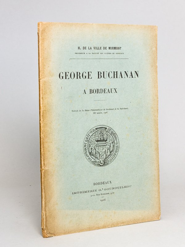 Extrait de la Revue Philomathique de Bordeaux et du Sud-Ouest, 1 brochure in-8 br., Imprimerie G. Gounouilhou, Bordeaux, 1906, 58 pp. Exemplaire dédicacé par Henri de la Ville de Mirmont (1858-1923) au grand bibliophile bordelais Bordes de Fortages (1846-1924). L'humaniste écossais Georges Buchanan (1506-1582) enseigna plusieurs années à Bordeaux, au Collège de Guyenne ; il fut notamment professeur de latin de Michel de Montaigne. Henri est le père de l'écrivain Jean de La Ville de Mirmont.