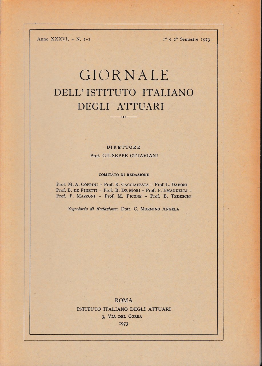 Giornale dell'Istituto Italiano degli Attuari. Anno XXXVI - n. 1-2, 1^e 2^ semestre 1973 | Livres anciens et modernes | direttore Giuseppe Ottaviani, ,direttore Giuseppe Ottaviani
