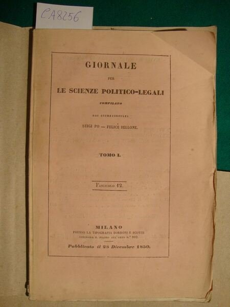Giornale per le scienze politico-legali compilato dai giureconsulti Luigi Po - Felice Bellone - Tomo I - Fascicolo 12 | Livres anciens et modernes | Po Luigi - Bellone Felice