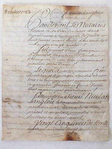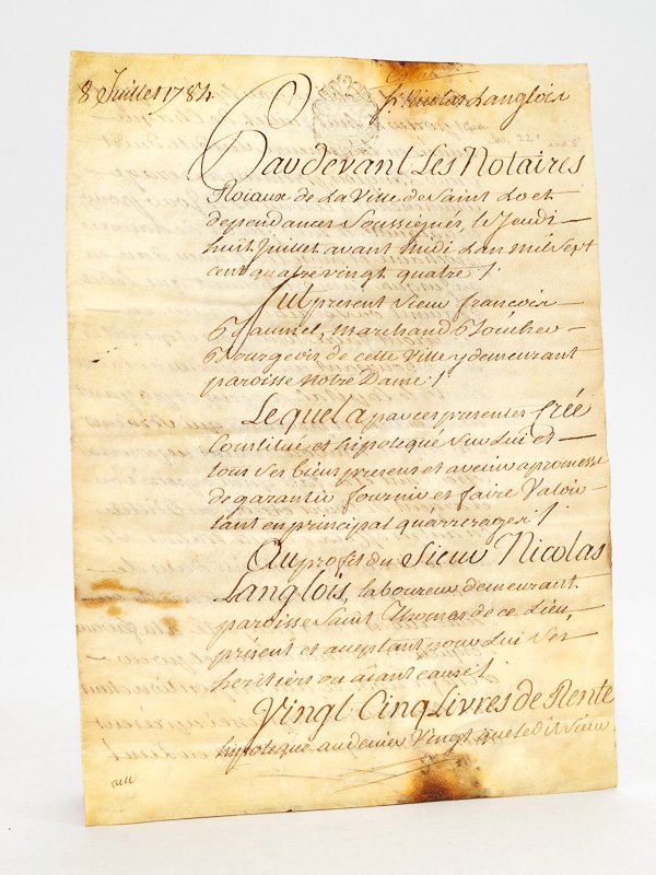 1 grosse sur vélin (parchemin) de 3 pp., 1784 : "Par devant les Notaires Roiaux de la Ville de Saint Lo et dépendances soussignés le Jeudi huit Juillet avant midi l'an mil sept cent quatre-vingt quatre. Fut présent Sieur François Baumet, Marchand Boucher, Bourgeois de cette Ville y demeurant paroisse Notre Dame. Lequel a par ces présentes . hipothéqué sur lui et tous ces biens présens et avenir a promesse de garantir fournir et faire valoir tant en principal qu'arrerager au profit du Sieur Nicolas Langlois, laboureur demeurant paroisse Saint Thomas de ce lieu, présent et acceptant pour lui ses héritiers ou aiant causes, Vingt-Cinq Livres de Rente" "Fait et passé à l'abbatial de Saint-Lo paroisse Sainte Croix en la demeure de Durier l'un des Notaires soussignés". Etat très satisfaisant (qq. brunissures)