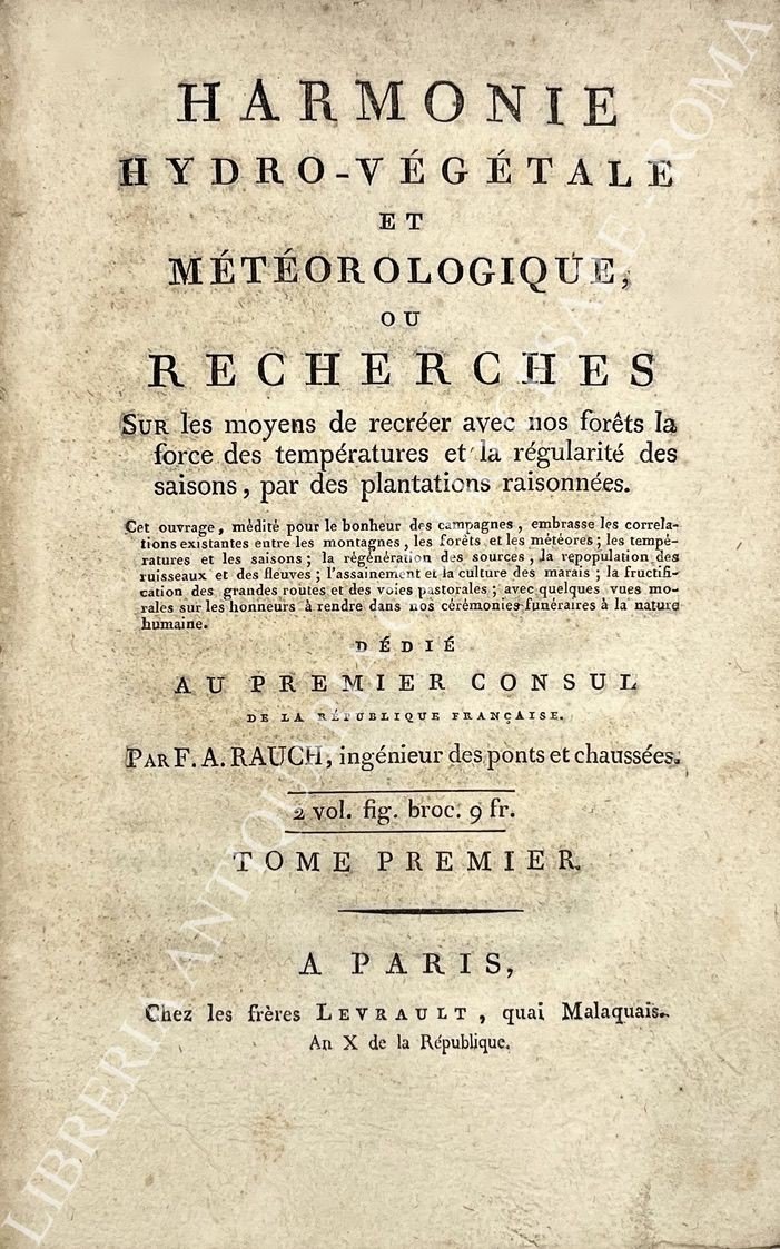 Harmonie hydro-vegetale et meteorologique ou recherches sur les moyens de recreer avec nos forets la force des temperatures et la regularite des saisons par des plantations raisonnees. dedie au premier consui de la republique francaise Par F.A. Rauch, ingenieur des ponts et chaussees