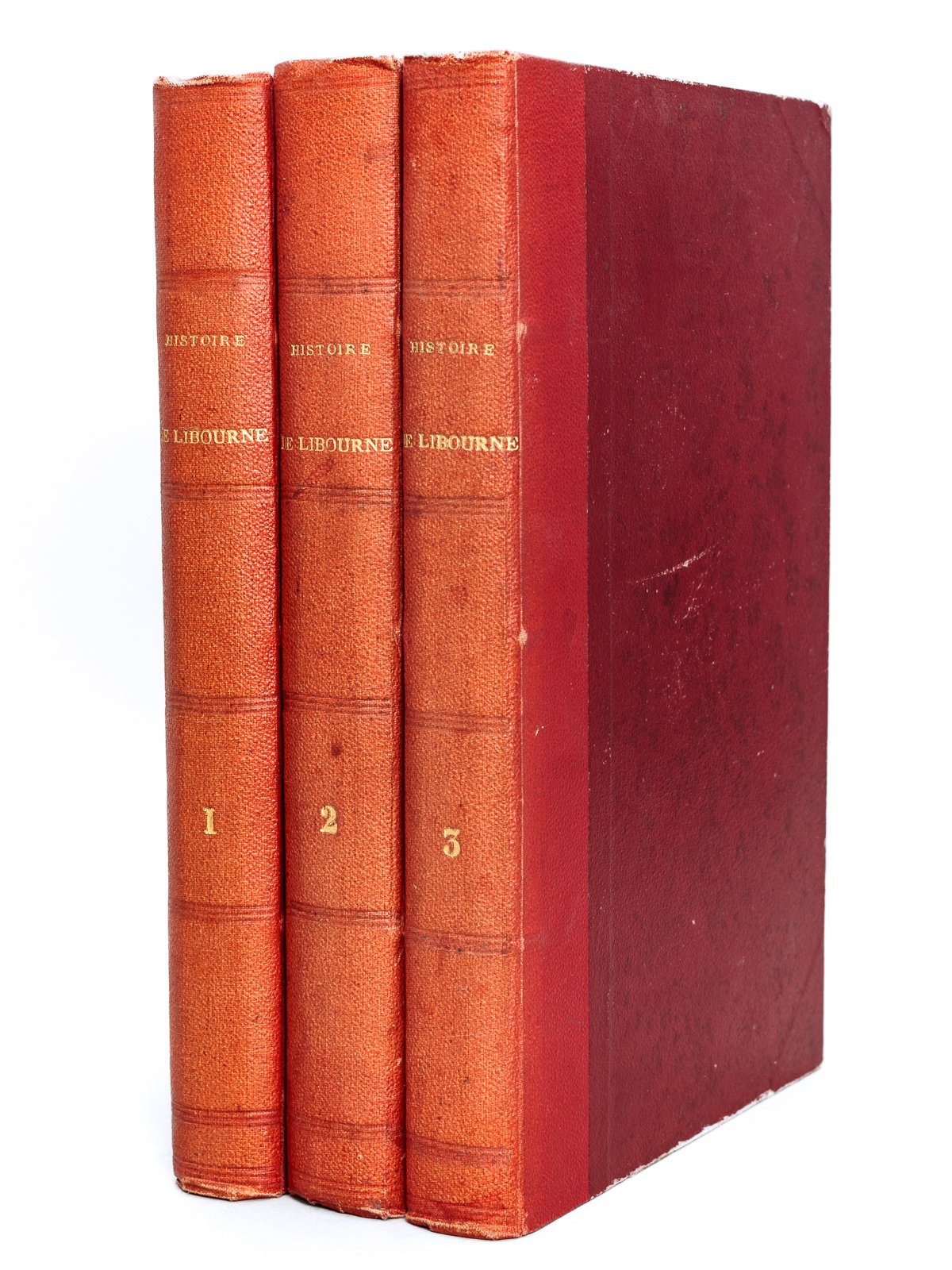 3 vol. grand in-8 reliure postérieure demi-percaline rouge, Chez Henry Faye, Bordeaux, 1845, xij-489 pp. et 1 f. d'errata ; 509 ; 444 pp. Rappel du titre complet : Histoire de Libourne et des autres villes et bourgs de son arrondissement (3 Tomes - Complet) [ Edition originale ] Accompagnée de celle des monuments religieux , civils et militaires, de celle des ordres monastiques, de celle des Ducs, Comtes, Marquis, Vicomtes, Chevaliers, etc. Intéressant exemplaire provenant de la bibliothèque de Bernard Ducasse, de la Société historique et archéologique du Libournais, qui a inséré certains documents et annotations. Dans le tome premier, il a inséré deux feuillets manuscrits au niveau des pièces justificatives (livre velu) ainsi que plusieurs notes manuscrites au crayon (et une au stylo), et une copie de l'acte de décès de Raymond Guinodie ; il a contrecollé en dernières gardes du tome second une copie des rectifications par Léo Drouyn des coquilles et fautes de lecture de Guinodie ; il a enfin glissé plusieurs feuillets manuscrits, avec quelques annotations marginales à l'encre, dans le troisième tome, précisant les variantes entre les deux éditions. Etat très satisfaisant (la page de titre du tome troisième est une photocopie, coupes lég. frottées, qq. défauts très mineurs par ailleurs).