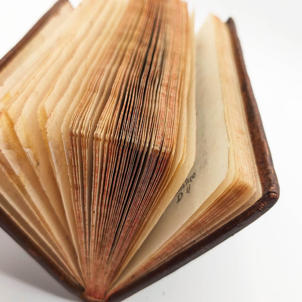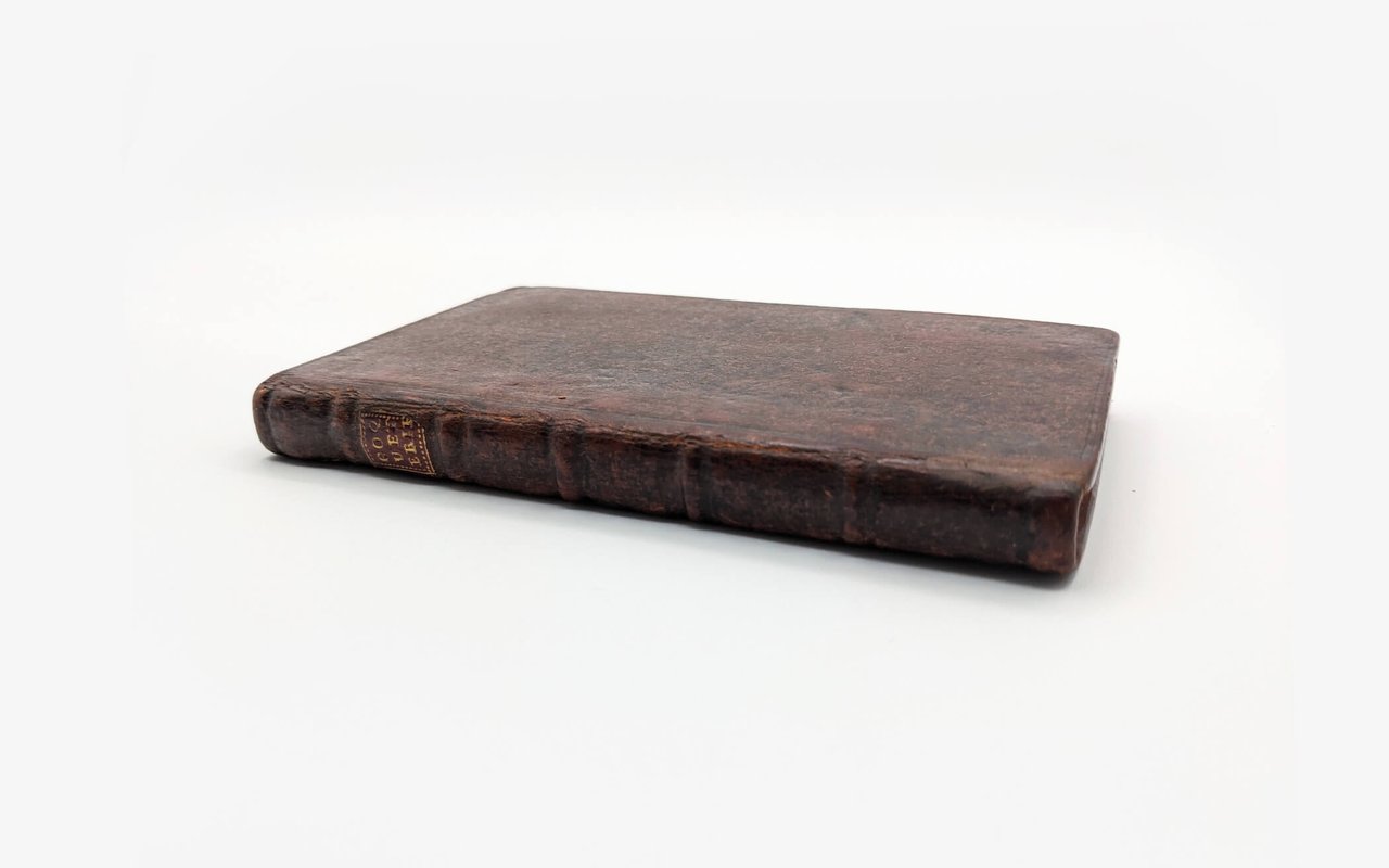 In-12, 163x97mm. Full marbled calf, spine with 5 raised bands with gilt title label on red Moroccan. Covers framed with a blind-stamped fillet. White counterguards in laid paper. Red edges (erased).