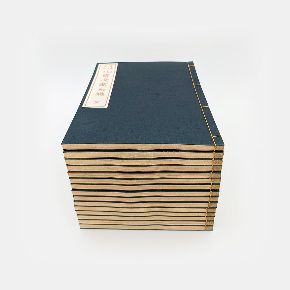 15 woodblock printed books, 1 introductory notebook in English and Japanese, traditional case with bone clasp.
