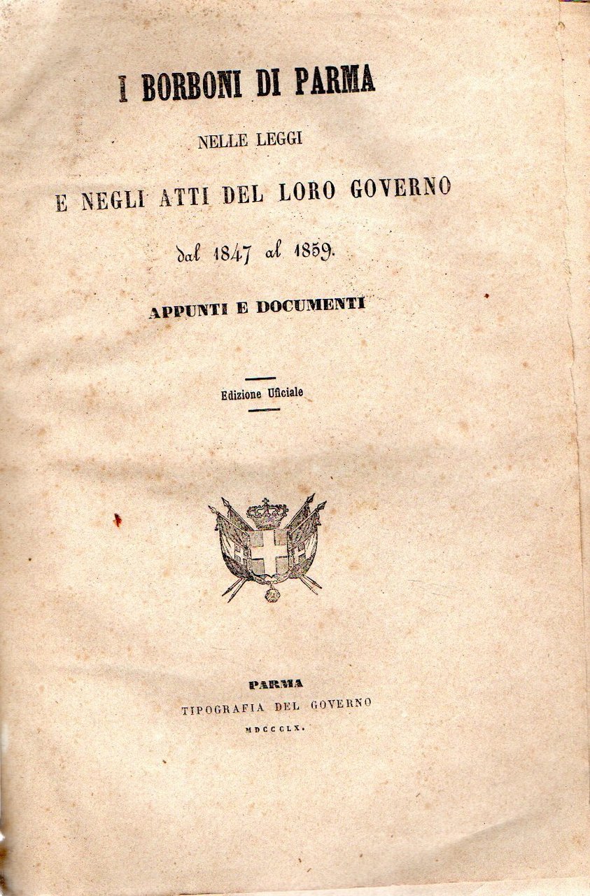I Borboni di Parma nelle leggi e negli atti del loro Governo dal 1847 al 1859. Appunti e Documenti. Edizione Ufficiale.