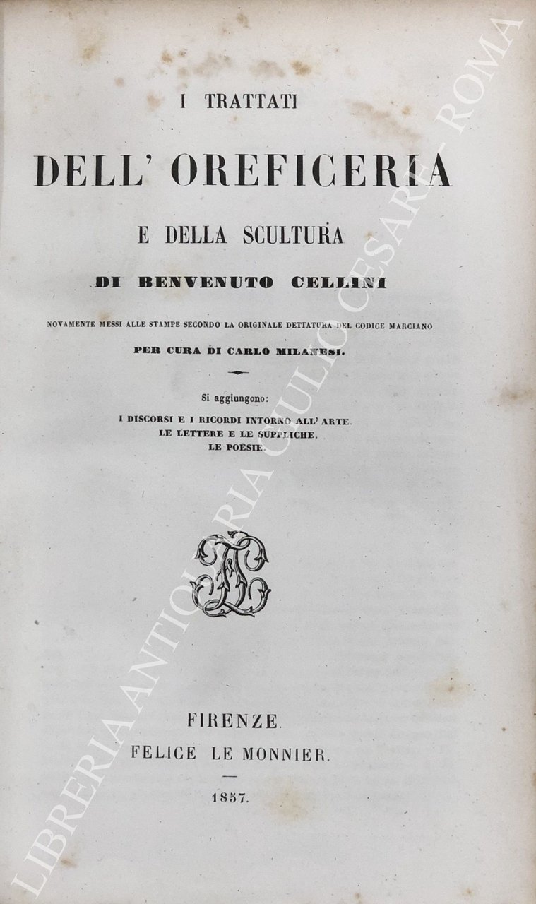 I trattati dell'oreficeria e della scultura di Benvenuto Cellini. Novamente messi alle stampe secondo la originale dettatura del Codice Marciano. Per cura di Carlo Milanesi. Si aggiungono i Discorsi e i Ricordi intorno all'arte. Le lettere e le suppliche. Le poesie