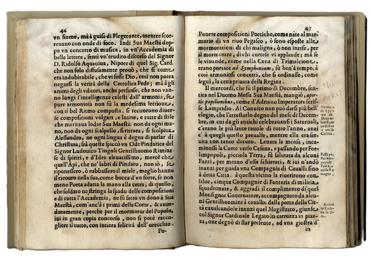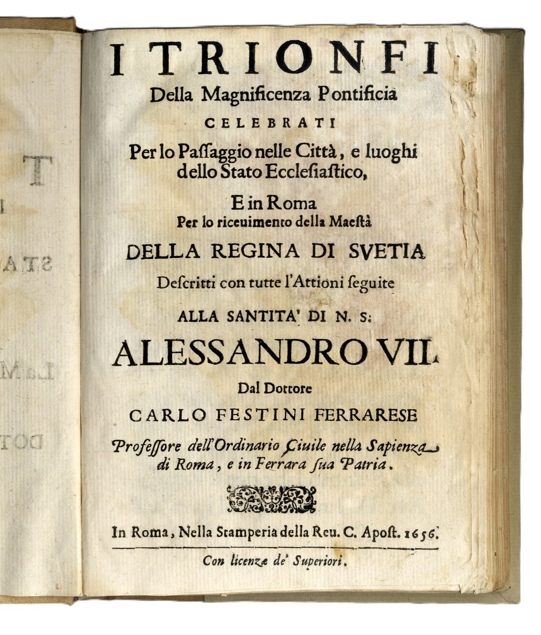 >In-8, pp. (16) 175 (1) , legatura moderna in mezza pergamena, titolo in oro al dorso. Tutto il volume è interessato da gore d'acqua. Il ferrarese Carlo Festini descrisse dettagliatamente in quest'opera i grandiosi festeggiamenti voluti da papa Alessandro VII in occasione dell'arrivo della singolare Regina svedese. Fu questo il primo viaggio a Roma di Cristina di Svezia dopo la sua conversione al cattolicesimo. L'accoglienza fu particolarmente fastosa per sottolineare la grande importanza di questa abiura e il conseguente successo del papato. Opera non comune. Esemplare da studio.