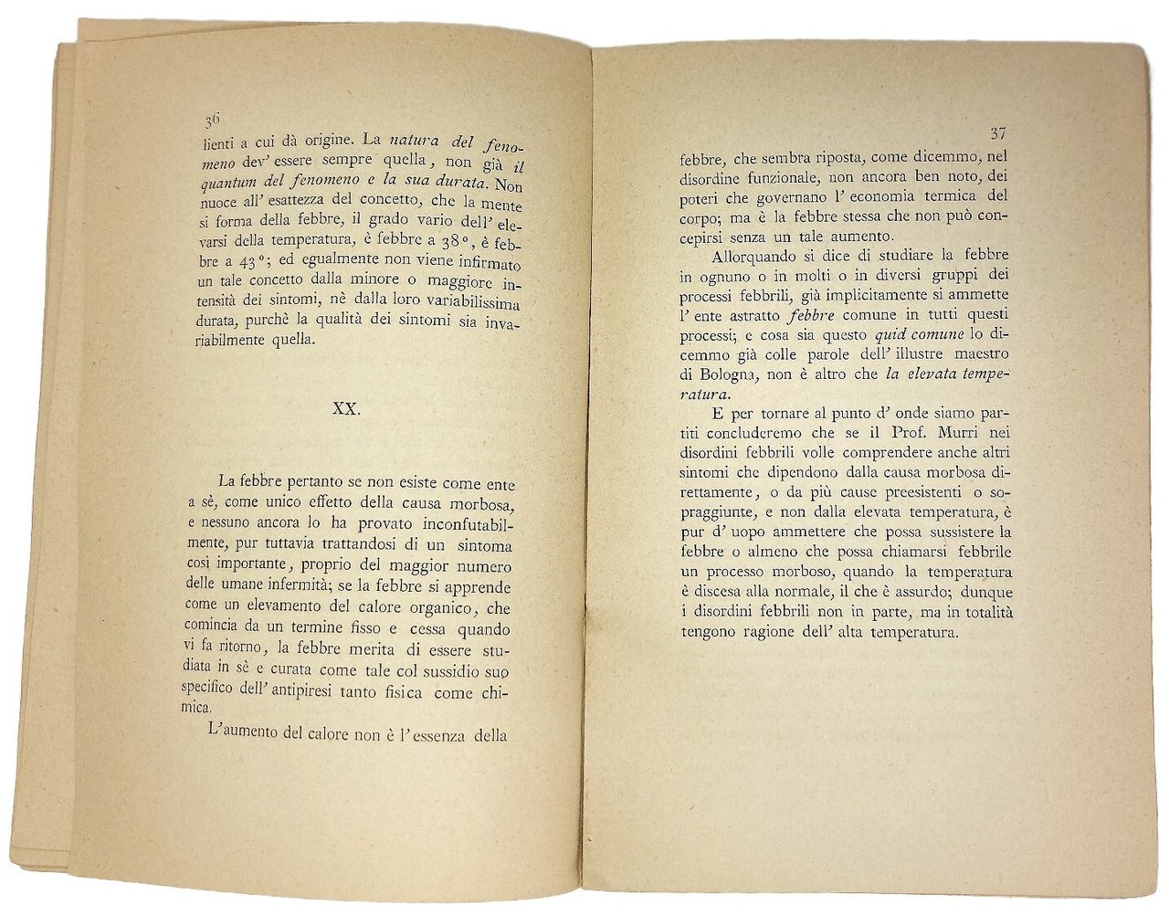 >8vo piccolo (mm 193x128), pp. 53, brochure editoriale a stampa. Curioso libretto che racconta i benefici dell'acqua fredda e dell'antipirina negli stati febbrili da tifo. Tracce di abrasioni sulla brochure ma buon esemplare. Interno ottimo, timbro annullato al frontespizio.
