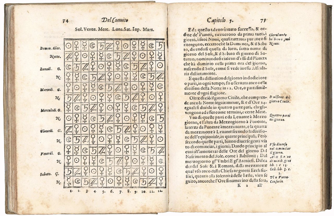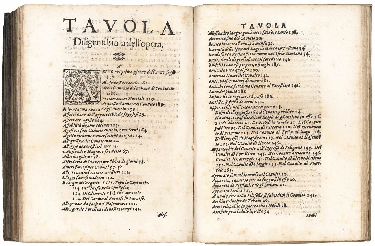 First edition, dedicated to Don Carlo de' Medici, of this comprehensive treatise on banqueting, hospitality and table manners. Originally from Marta near Viterbo, the author regards friendship as the purpose of a banquet and considers hospitality towards strangers to be sacred. He considers every aspect that contributes to the joy of a banquet and the pleasure of a stay, from practical elements such as food, table settings, and service, to more “philosophical” elements such as friendship, good manners, and conversation. He provides numerous examples from both ancient and modern history, describing Gregory XIII's lodgings at Caprarola and at La Sforzesca, for instance.