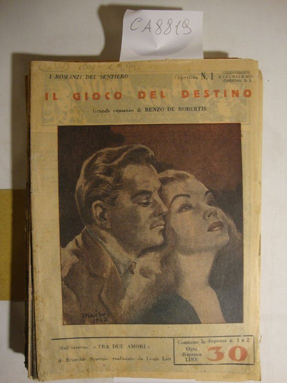 (Collana : I Romanzi del Sentiero) Esemplare scompleto ma di rarità assoluta. Una soap opera del tempo. Pubblicazione di un romanzo a puntate. Disponibili i numeri 1, 2, 3, 4, 5, 6, 7, 8, 9, 10, 11, 12, 13, 15, 16, 17, 18 (manca nella sequenza il 14 e tutti i numeri successivi al 18). Fascicoli con ill. in b.n. f.t. inframezzate nel testo. Le coperte vennero sviluppate a colori con illustrazioni di Augusto Pedrazza. All'interno di ogni coperta si racchiudono due numeri della pubblicazione, ciascuno sviluppato per un sedicesimo. Le coperte presentano all'interno delle stesse ed in quarta una pubblicazione di un fumetto, anch'esso a puntate, dal titolo - Fra due amori - , romanzo di Brunilde Scavino realizzato da Louis Lan. La pubblicazione proseguì con numerosi altri numeri qui non disponibili. In OPAC SBN figura di 1918 pp, ripartite in 120 dispense - DETTAGLIO DELLE CONDIZIONI : Segni d'invecchiamento con danni e con marginali strappetti. Fioriture sparse in coperta ed alle pagg. che non ledono la leggibilità del testo - (61b).