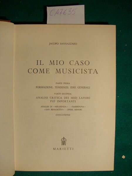 Parte prima: formazione, tendenze e idee generali - Parte seconda: analisi critica dei miei lavori più importanti (analisi di - Melisenza - - - Barberina - - - San Benedetto - , opere minori) - Conclusione - DETTAGLIO DELLE CONDIZIONI : Macchie alle tela della sopraccoperta, alle pagg. di guardia ed ai tagli - .