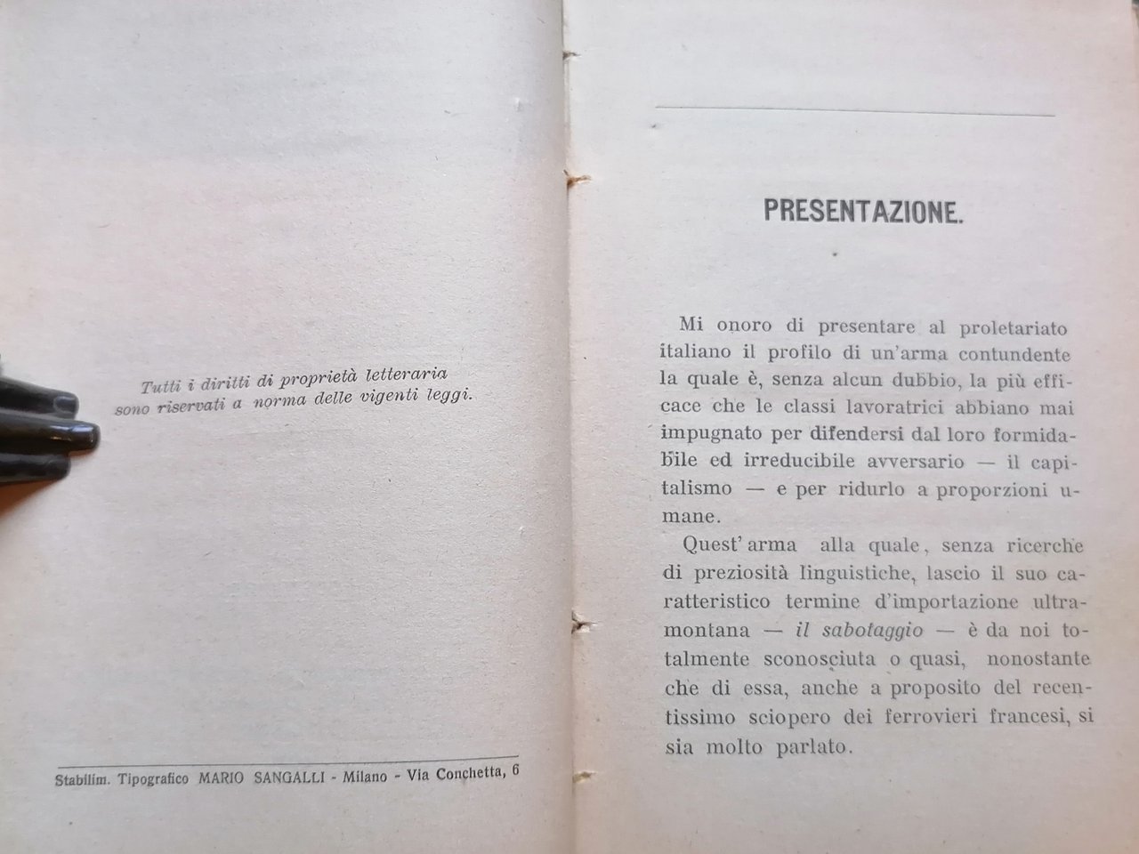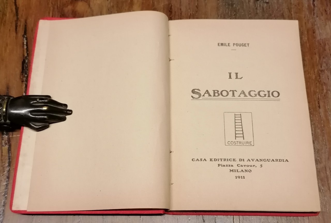 • Prima edizione italiana, stampata nello Stab. Tipografico Mario Sangalli, dell'opuscolo "Le Sabotage" pubblicato a Parigi dalla "Librairie des Sciences Politiques & Sociales" di Marcel Rivière et Cie, (1911)