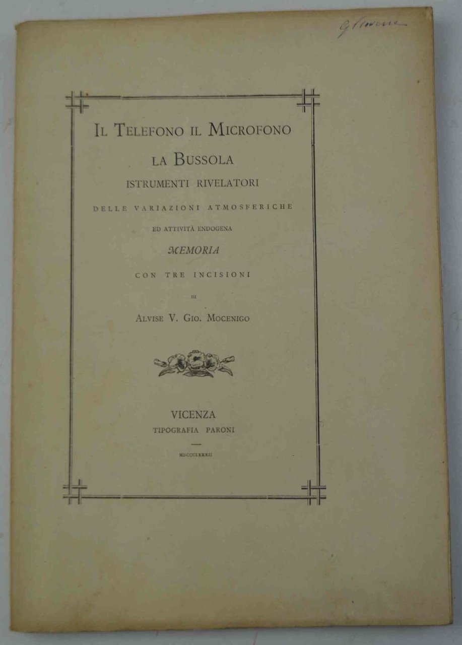 Il Telefono il Microfono la Bussola. Istrumenti rivelatori delle variazioni atmosferiche ed attività endogena. Memoria con tre incisioni. | Livres anciens et modernes | MOCENIGO ALVISE V.G.