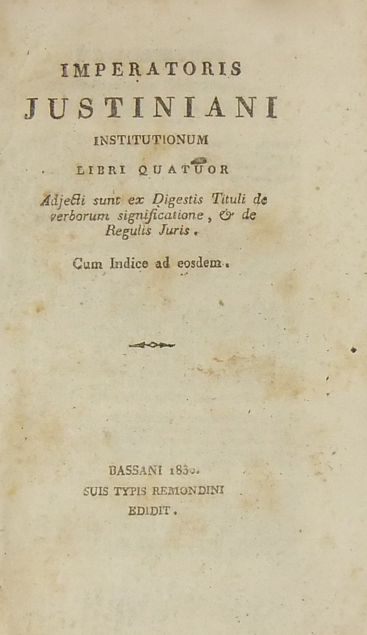 Institutionum Libri quatuor. Adjecti sunt ex Digestis Tituli de verborum significatione & de Regulis Juris. Cum Indice ad eosdem | Livres anciens et modernes | Iustinianus Augustus - Giustiniano