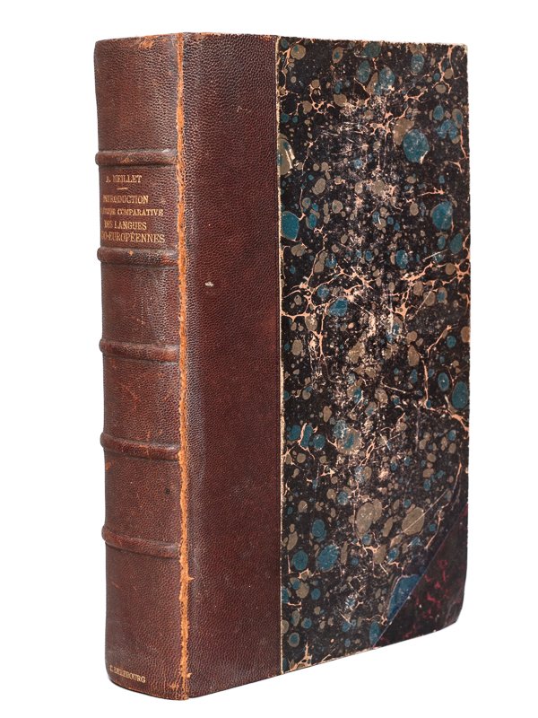 1 vol. in-8 reliure de l'époque demi-chagrin brun, dos à 5 nerfs, couvertures conservées, Librairie Hachette et Cie, Paris, 1903, XXIV-434 pp. Rare exemplaire de l'édition originale de cet important ouvrage qui visait à "indiquer brièvement les concordances qu'on observe entre les diverses langues indo-européennes et les conclusions qu'on en peut tirer". Antoine Meillet (1866-1936) formera toute une génération de brillants étudiants, parmi lesquels Emile Benveniste, Georges Dumézil ou encore Jean Paulhan dont il dirigea la thèse sur la sémantique du proverbe. Etat très satisfaisant (dos lég. frotté, restauration ancienne à un coin, qq. rouss.)