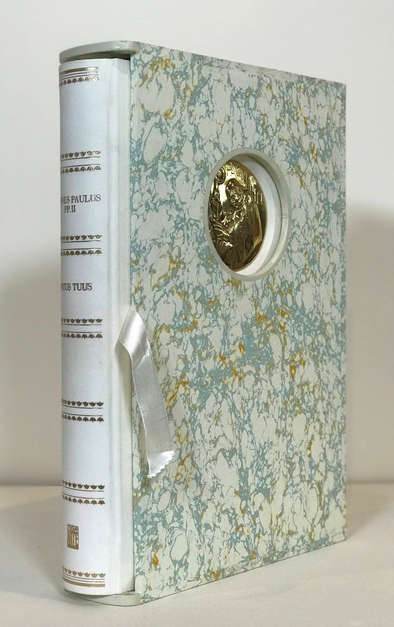 Volume in folio (44 cm), legatura in pergamena naturale con iscrizioni in oro realizzata manualmente presso la legatoria L'Arte del Libro di Todi. Il nostro esemplare fa parte della speciale tiratura in lingua italiana di 99 esemplari in numeri romani riservata alle più importanti personalità istituzionali e religiose del mondo; il nostro è l'esemplare VI/XCIX. I testi, in caratteri bodoniani, sono stampati su carta in cotone, impreziosita dalla filigrana papale appositamente fabbricata alla forma tonda nelle Cartiere d'Arches in Francia. Il volume è impreziosito sulla prima di copertina dall'opera "Ioannes Paulus II" e sulla quarta di copertina dall'opera "Mater Pietatis", sculture originali a bassorilievo in argento 925 0/00 del Maestro Floriano Bodini realizzate a conio dal laboratorio artistico Senesi di Pognano. Il volume è numerato e firmato al colophon dal Maestro Bodini. Si presenta conservato nel suo cofanetto originale. Ottimo stato di coservazione