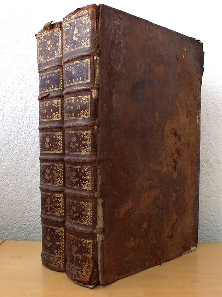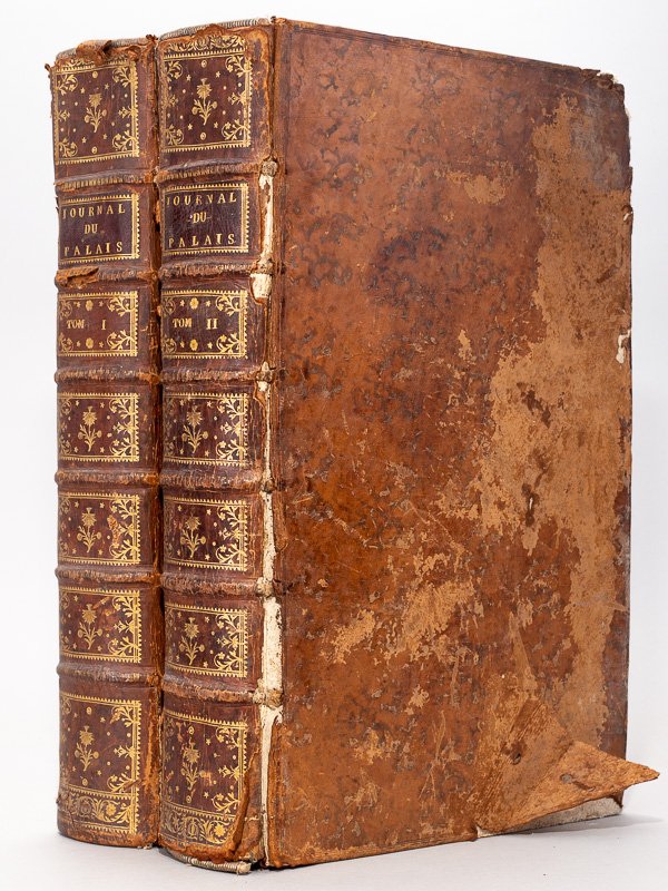 Quatrième édition, revue, corrigée et Augmentée, 2 vol. in-folio reliure de l'époque pleine basane marbrée marron, dos à 6 nerfs orné (fleurons), Chez Cavelier, Paris, 1755, 1 f. blanc, 14 ff. (titre, avis, épistre, tables), 964 pp., 17 ff. n. ch. ; 7 ff., 1042 pp. (texte sur deux colonnes) : Titre complet : Journal du Palais, ou Recueil des Principales Décisions de Tous les Parlemens et Cours Souveraines de France (2 Tomes - Complet). Journal du Palais, ou Recueil des Principales Décisions de Tous les Parlemens et Cours Souveraines de France, sur les Questions les plus importantes de Droit Civil, de Coutume, de Matières Criminelles & Bénéficiales, & de Droit Public. Tome Premier, contenant les arrêts depuis l'année 1660, jusqu'en 1678 ; Tome Second, contenant les arrêts depuis l'année 1679, jusqu'en 1700 Rare exemplaire de la dernière édition (très enrichi par rapport aux précédentes éditions) de l'un des plus célèbre (et des meilleurs) des recueils d'arrêts. Camus & Dupin, 1819, 888 : "Ce Recueil est, sans contredit, le meilleur de ceux des arrêts du parlement de Paris". Etat satisfaisant (qq. accrocs en coiffes, fentes en mors, plats et coupes frottés avec petits mq., bon état intérieur)