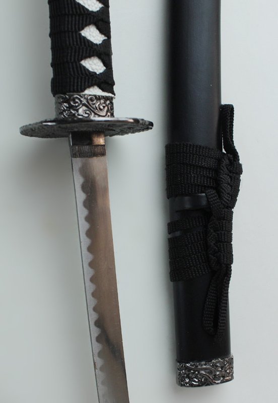(Codice ZZ/0884) Katana in acciaio (non affilata) lunghezza totale cm 41, lama cm 27. Elsa cm 14 in legno e plastica con finiture in metallo e tessuto. Fodero in legno sagomato, laccato nero, con scritte in giapponese e lacci annodati nello stile smurai. Supporto in legno nero con scritta in giapponese. Ingombro totale: cm 45x12,5x6 circa. ~~~ SPEDIZIONE IN ITALIA SEMPRE TRACCIATA