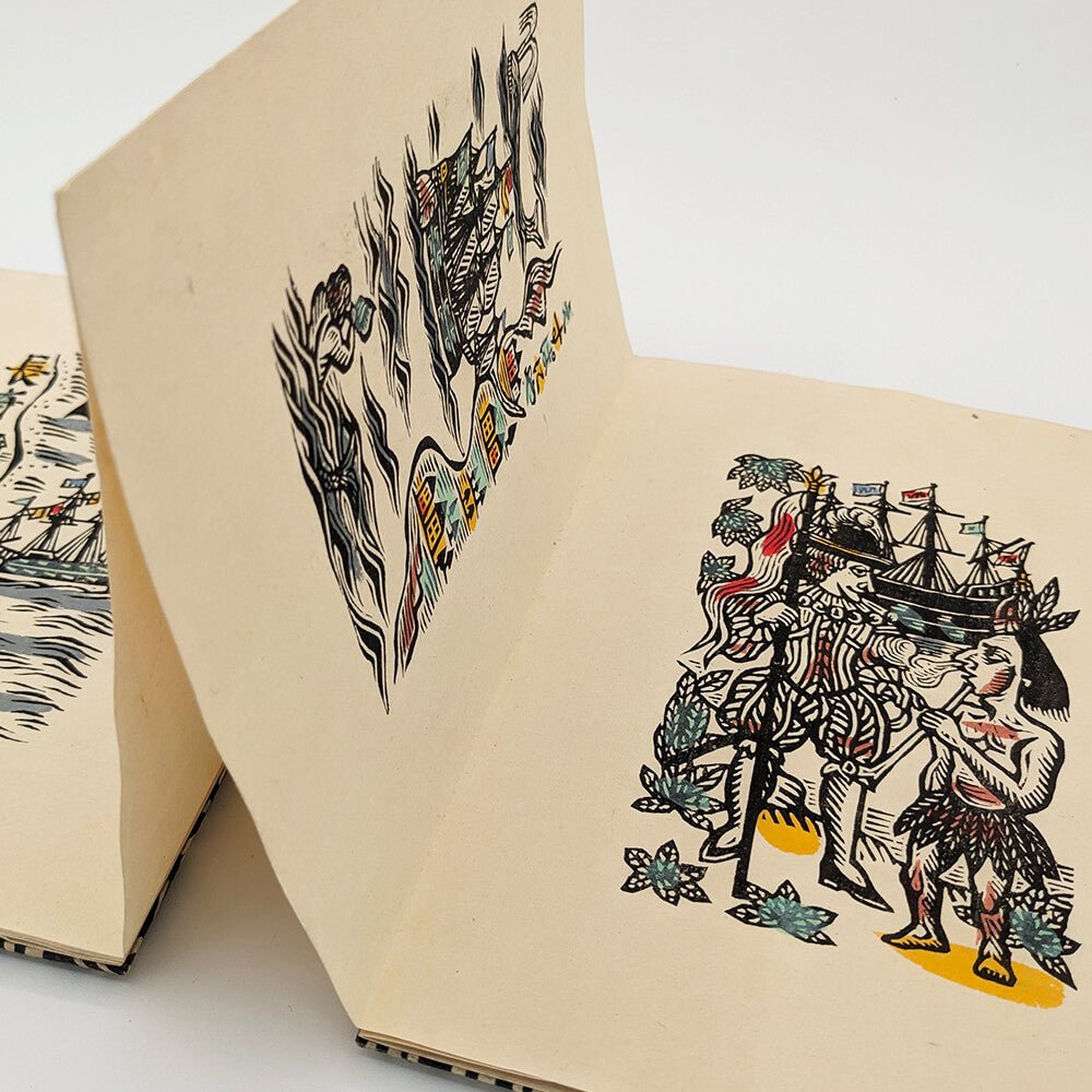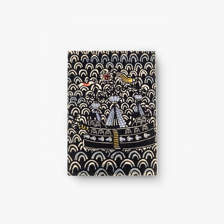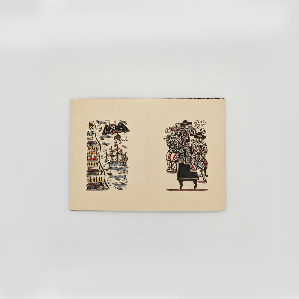 In March 1945, as the Pacific War raged, Sumio Kawakami (1895-1972) decided to retire from his position as an English teacher at Utsunomiya Prefectural High School, where he had worked for 20 years, and dedicate himself fully to the craft of woodblock printing. Kawakami developed a style influenced by the Meiji Kaika and Nagasaki Nanban periods. His primitive, rustic drawing style and his vivid, limited color palette evoke a profound poetry, nostalgic for a bygone era. This book is part of a series printed by the artist in the 1940s on the Nanban theme.
