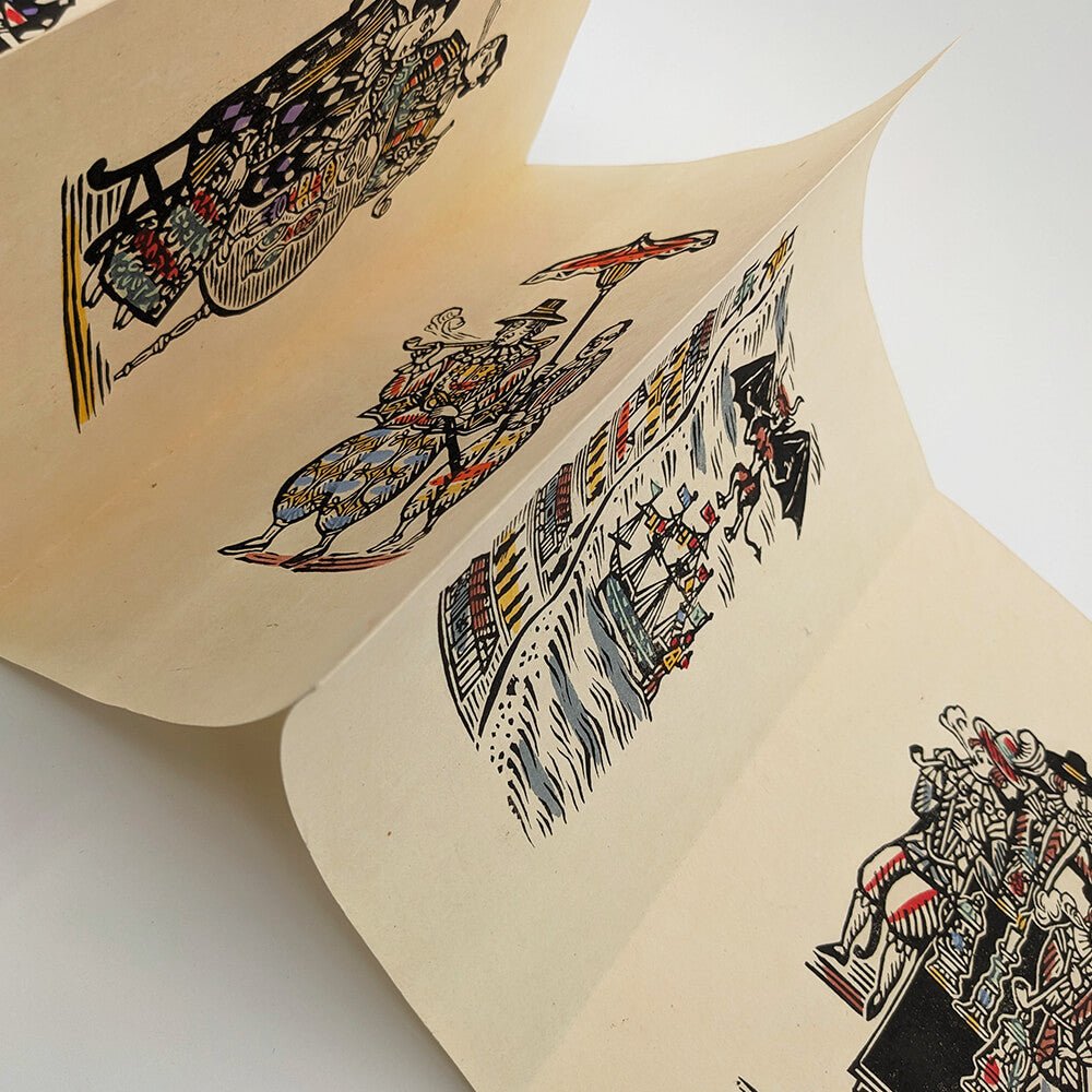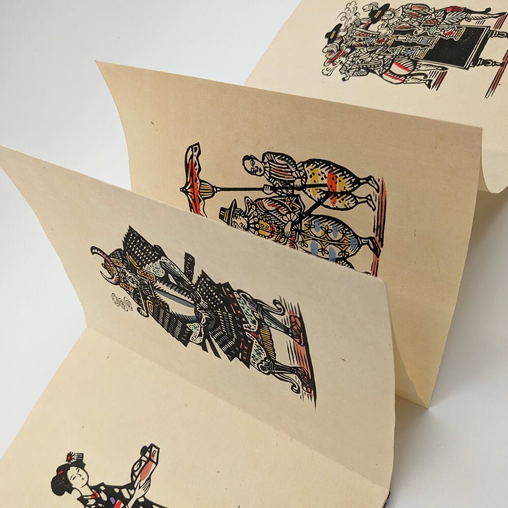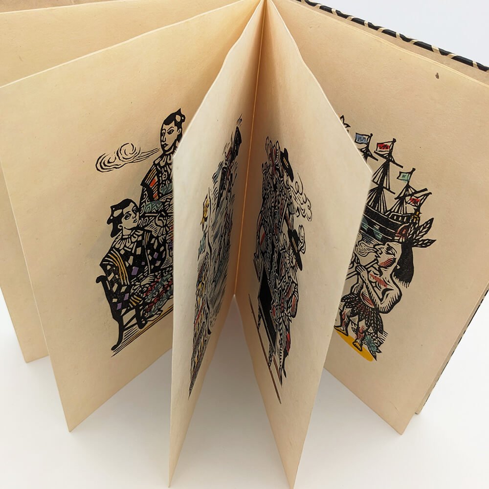 One 165x235mm accordion-fold book containing 10 hand-painted woodblock prints with two hand-painted woodblock prints on the cover. Original printed slipcase.