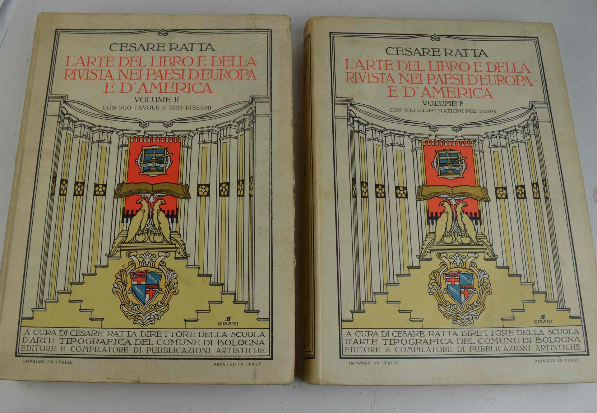 Due volumi di cm. 35, pp. (4) 424 e 590 illustrazioni; pp. xxxiii (3) xii (3) + 1025 disegni in 500 tavole. Legatura editoriale in cartonato rigido interamente illustrato in cromolitografia (Cisari) con belle sguardie decorate. Esemplare fresco ed in ottimo stato di conservazione. Edizione stampata in soli 750 esempl. numerati. Opera munita di un prodigioso apparato iconografico formato da illustrazioni e tavole in nero, in seppia ed a colori. Celebre lavoro monografico che riguarda l'arte del libro di tutto il mondo, con riproduzioni di frontespizi, copertine, illustrazioni dei migliori artisti.
