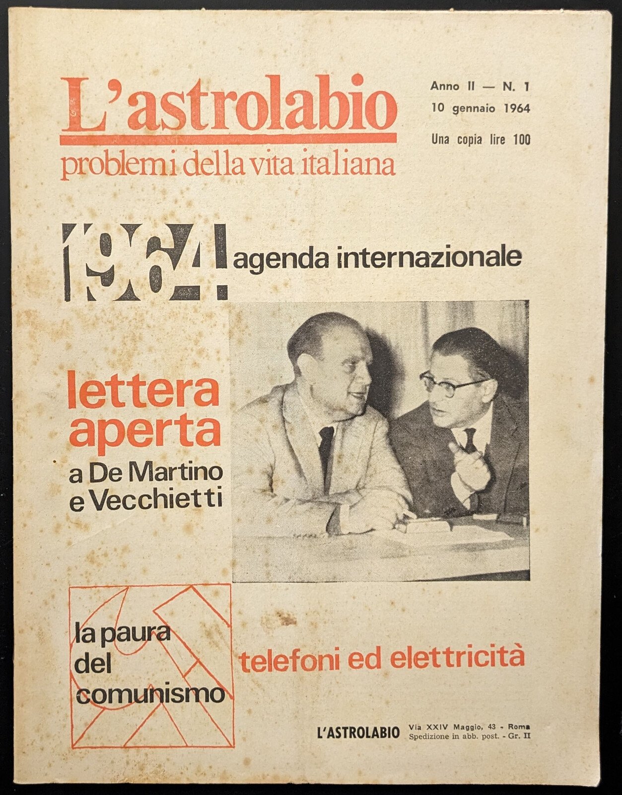 Opuscolo vintage. Argomento: Saggi. Autore: AA. VV. Editore: Tip. Gate. Luogo: Roma. Anno: 1964. Formato: in-4°. Pagg: 40. Legatura: Punto metallico. Conservazione: buona. Roma, 10 gennaio 1964 - Anno II - N. 1. Illustrazioni in bn all'interno del testo.