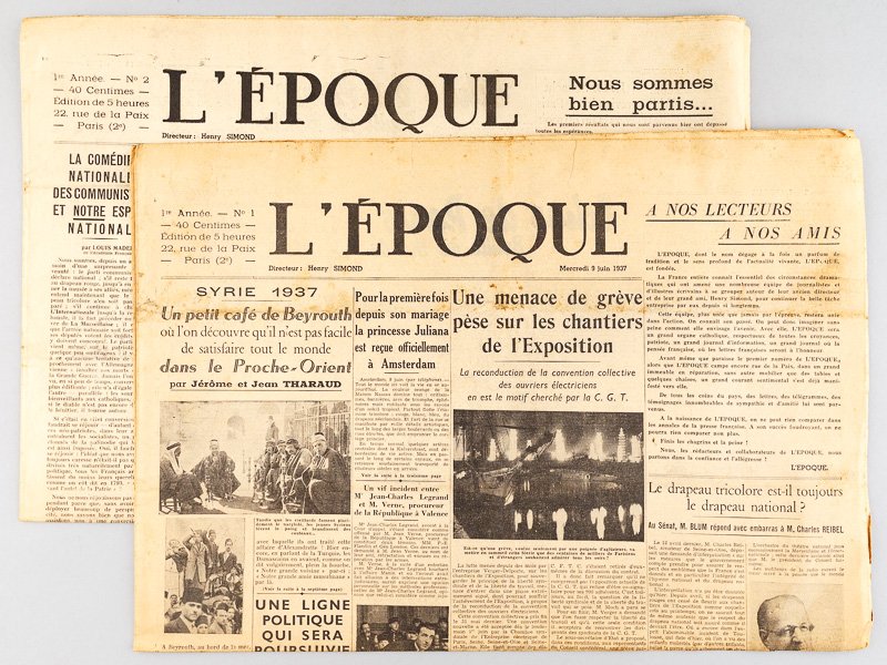 2 numéros in-folio, L'Epoque. [ Les deux premiers numéros du quotidien "L'Epoque" ] 1ère Année n° 1 : mercredi 9 juin 1937 : n° 2 : Jeudi 10 juin 1937, 10 pp. par numéro" Rare tête de série réunissant les 2 premiers numéros du quotidien "L'Epoque". Le premier éditorial précise : "La France entière connaît l'essentiel des circonstances dramatiques qui ont amené une nombreuse équipe de journalistes et d'illustres écrivains à se grouper autour de leur ancien directeur et de leur grand ami, Henry Simond, pour continuer la belle tâche entreprise par eux depuis si longtemps". Le numéro s'ouvre sur un article des frères Tharaud : "Un petit café de Beyrouth où l'on découvre qu'il n'est pas facile de satisfaire tout le monde dans le Proche-Orient".