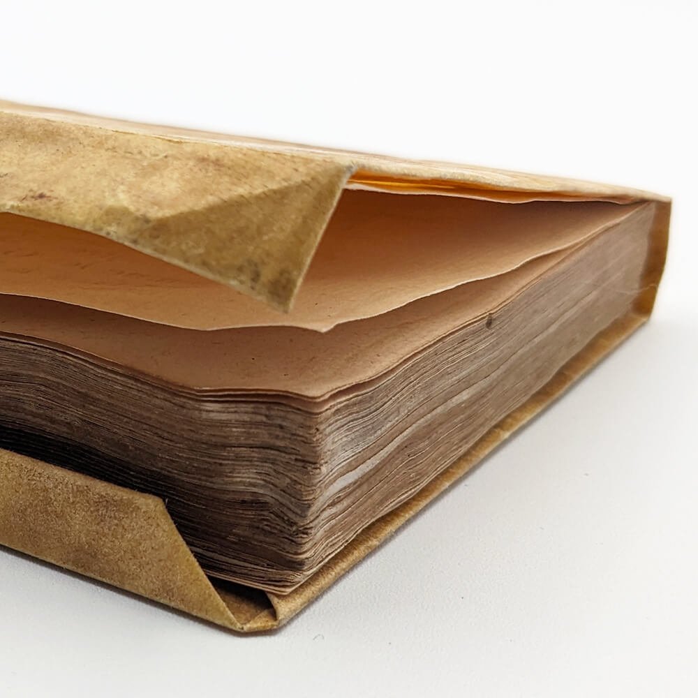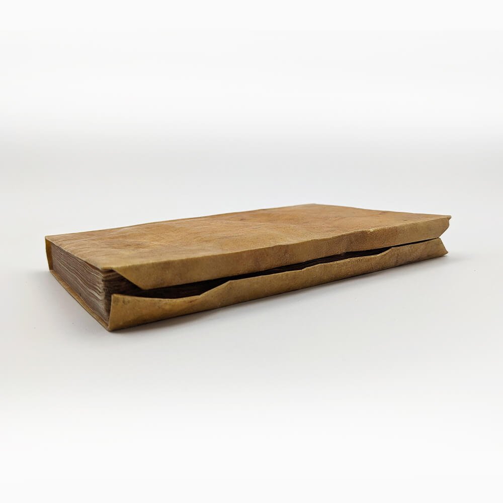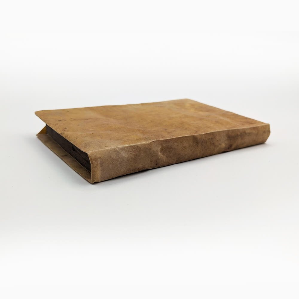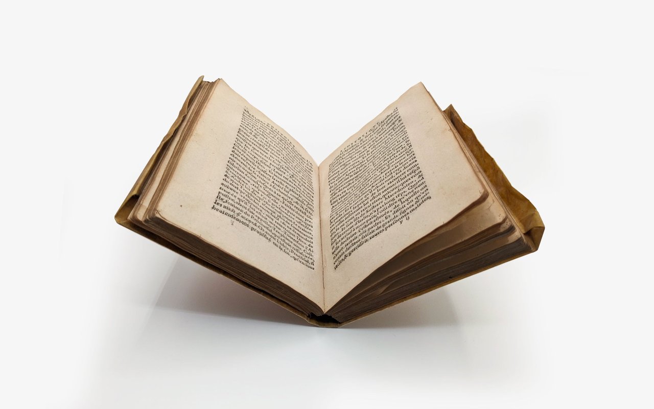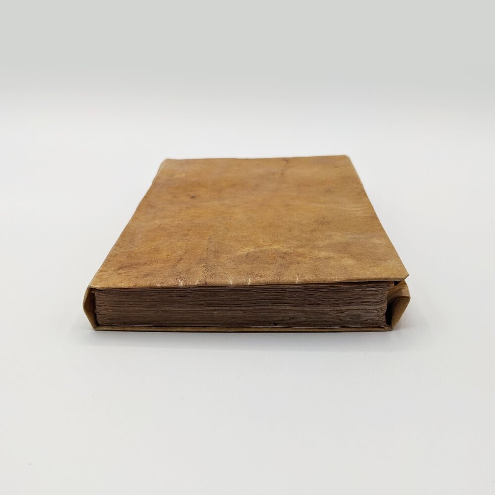 Duodecimo (117x111mm) - Limp vellum binding with flaps, flat spine, untitled. (8) ll., (144) ll. Strange blank endpapers at the beginning and end with traces of printing from another work, suggesting printer's scraps. The border of the endpapers appears different from the border of the book; it does not show the same signs of aging, suggesting a post-printing assembly.