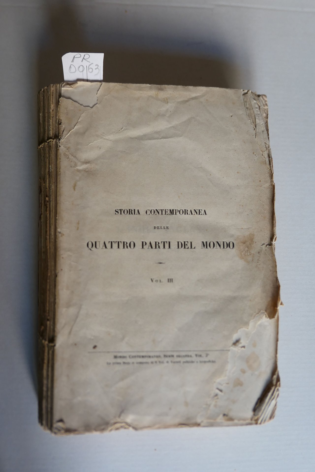 Volume unico che costituisce il vol.III della Storia contemporanea delle quattro parti del mondo, l'autore è un antico ufficiale al servizio di S.M. britannica nelle Indie - DETTAGLIO DELLE CONDIZIONI : Privo di coperta e con mancanze nella parte inferiore destra delle prime due pagine, le pp.245 ,246 sono posposte. Esemplare da sottoporre ad intervento di restauro e/o legatura - .