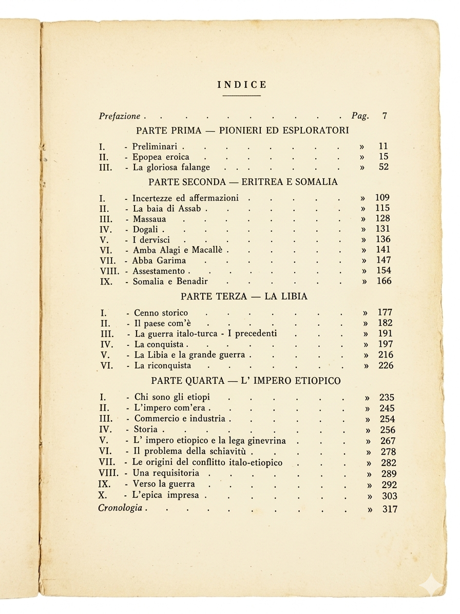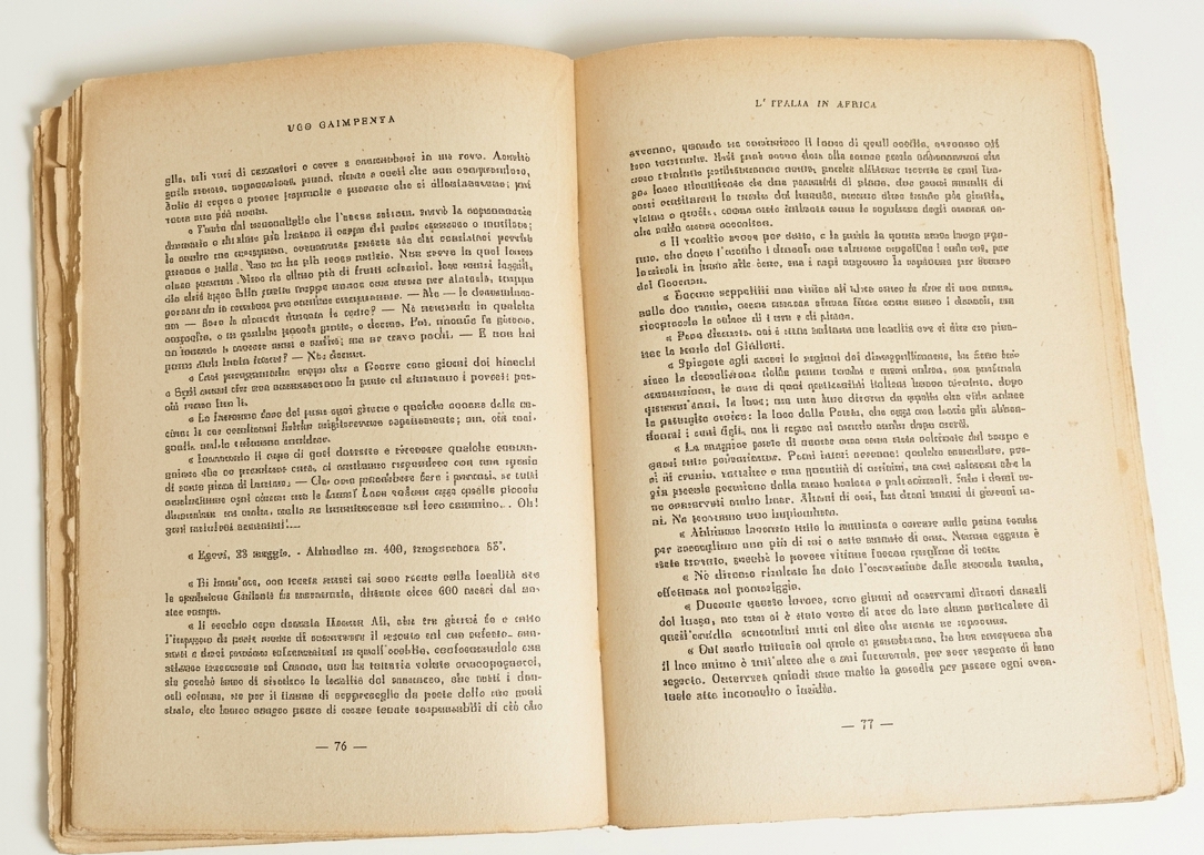 L'ITALIA IN AFRICA Dai pionieri all'Impero di Ugo Caimpenta. Prefazione di S.E. Maurizio RavaEdizioni "Aurora", Milano, 1937. 381 pagine + 32 tavole fotografiche fuori testo. Copertina editoriale in brossura illustrata a colori. Stato di conservazione: buono (copertina molto usurata con mancanze e strappi, il piatto anteriore è in parte originale e in parte fotocopiato, pagine ingiallite).