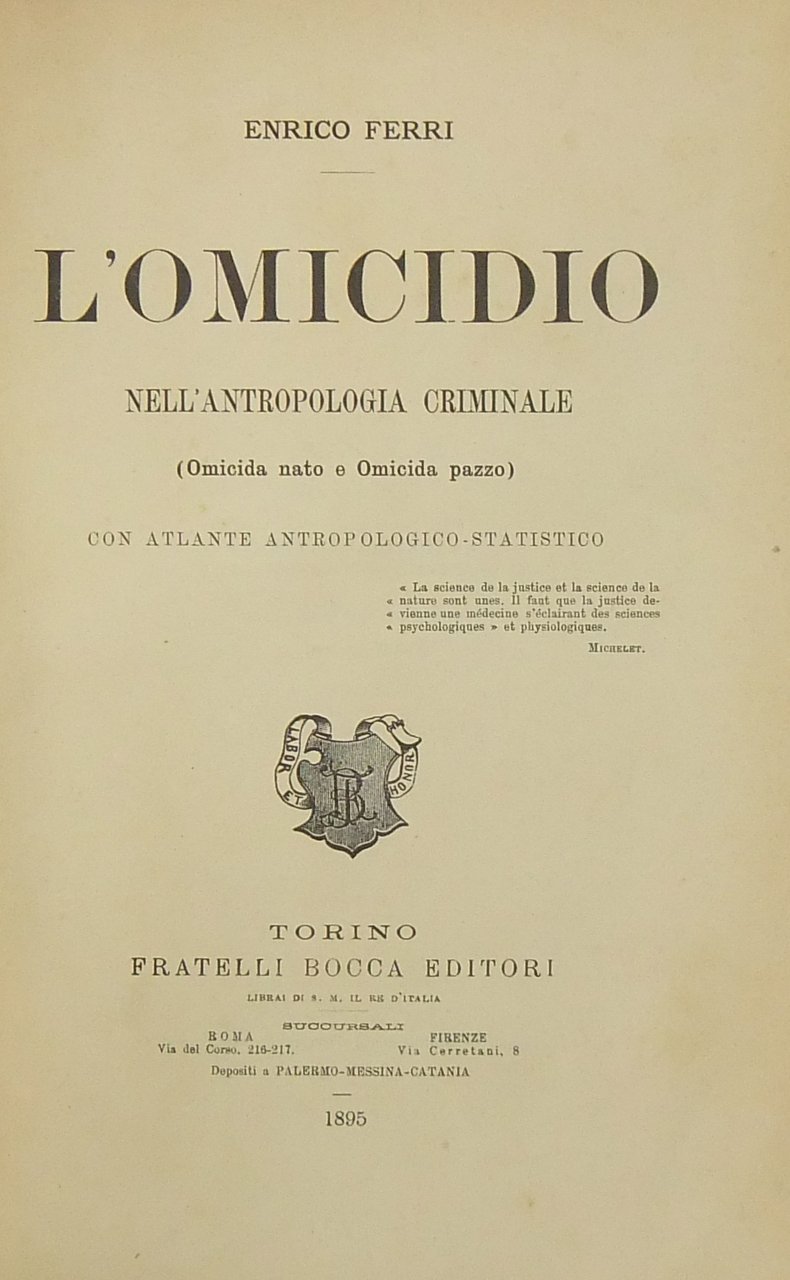 L'omicidio nell'antropologia criminale. (Omicida nato e Omicida pazzo) + Atlante antropologico-statistico dell'omicidio