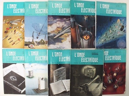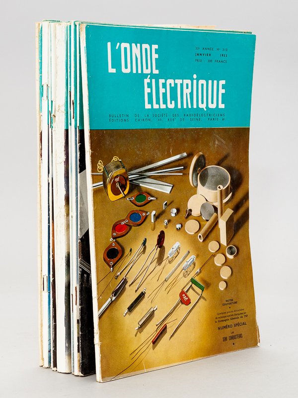 11 numéros en 10 vol. in-4 br., couv. ill., ill. noir et blanc, L'Onde électrique - Bulletin de la Société des Radioélectriciens, éditions Chiron, Paris, 1953, env. 650 pp. Au sommaire : n° 310 Numéro Spécial consacré aux semi-conducteurs ; n° 311 François Bedeau ; L'organisation internationale des radiocommunications et le problème mondial de l'assignation des fréquences ; Note sur le canal nécessaire à la transmission de la télévision en couleurs ; Systèmes de déviation électronique et leur aberration ; Systèmes dynamiques à deux plans ; Sur la répartition du courant et de la tension des antennes cylindriques, elliptiques ou coniques ; n° 312 La 10e Assemblée Générale de l'U.R.S.I ; n° 313 Tradition et nouveauté en radioélectricité ; Procédé réversible pour l'enregistrement et pour la reproduction électronique des films cinématographiques ; La notion de fréquence instantanée ; Champ dans un guide rectangulaire à membrane conductrice ; Calcul d'un amplificateur de puissance pour moteur à courant continu ; n° 314 Numéro Spécial Les aides radioélectriques à la navigation ; n° 315 Mesure précise des fréquences entre 12000 et 37000 MHz ; Influence des pertes dans les lignes H.F. ; Les récepteurs de bruits radioélectriques : un radiomètre de 1200 Mc/s et quelques applications ; Accoustique musical : Sur la coloration des bruits blancs en acoustique ; Le XVIIe Salon de la pièce détachée radio ; n° 317-318 Les centres émetteurs de Sélestat et d'Allouis de la Radiodiffusion et Télévision Française ; Les propriétés et les applications des thermistances ; Pièces détachées pour conditions sévères d'emploi ; Câble coaxial à haute flexibilité avec conducteur extérieur hélicoïdal ; Répondeur passif de radar à cristal ; Construction géométrique de la transformation homographique ; n° 319 : Prospection radioactive des minérais uranifères ; Equipements électroniques utilisés dans la recherche géologique en profondeur par méthodes radioactives ; Méthode optique oour la mesure des constantes diaélectriques et magnétiques ; Etude acoustique de grandes salles sur maquettes ; Notes sur l'application de la réaction négative aux dispositifs électro-acoustiques ; Congrès de l'Enregistrement sonore ; n° 320 : Théorie du canon électronique triode à symétrie cylindrique ; Note sur l'influence de la phase en télévision ; La mesure de faibles charges électriques par la technique des impulsions ; Information et cybernétique ; Les industries radioélectriques au XXe salon de l'aéronautique ; n° 321 : Essais de transmissions par faisceaux hertziens sur un long parcours en visibilité optique entre la France et la Suisse ; Régulateur de température pour la métallurgie du Germanium ; Les réacteurs nucléaires ; Contrôle du réacteur atomique de Saclay ; Contrôle des installations de refroidissement du réacteur de Saclay ; Table des matières du Volume XXXIII. Etat satisfaisant (couv. frottées avec accrocs, couv. du n° 321 décrochée, intérieurs en bon état). Prix pour l'ensemble. Ensemble peu courant. Poids de 3 Kg