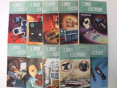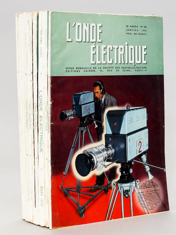 11 numéros en 10 vol. in-4 br., couv. ill., ill. noir et blanc, L'Onde électrique - Revue Mensuelle de la Société des Radioélectriciens, éditions Chiron, Paris, 1956, env. 1010 pp. Au sommaire : n° 346 Problèmes physiques posés par la transmission par faisceaux hertziens ; Essais de diversité et étude de l'effet de focalisation sur des liaisons longues en visibilité ; Etude de l'influence de la turbulence atmosphérique sur des liaisons méditerranéennes ; Fadings d'interférence causés par des discontinuités frontales ; Récepteurs de télévision à phase linéaire ; Réflecteurs passifs pour faisceaux hertziens ; n° 347 : Le Stabilidyne ; Etude des états d'équilibre d'un basculeur bistable en vue d'un fonctionnement sûr et durable ; Cavités sphériques découpées ; Méthode d'intégration des équations de Maxwell dans le cas du vide ; La télévision en couleur ; La Télévision en couleur aux USA ; n° 348 Numéro spécial La pièce détachée professionnelle radioélectrique ; n° 350 : Numéro consa&cré à l'accoustique architecturale ; n° 351 : Introduction à l'étude des phénomènes magnéto-optiques dans les ferrites dans le domaine des hyperfréquences ; Relations entre la structure des ferrites et les conditions de leur résonance dans les guides d'ondes ; Les équipements de radiocommunication à bande latérale unique ; Un fréquencemètre de précision réalisé au centre de mesure de Noiseau ; La normalisation des équipements de télévison à la RTF ; n° 352 Compte-rendu de la journée du 5 novembre 1955 consacrée à l'évolution du Progrès Mécanique sous l'influence conjuguée de la Mécanique et de l'électronique ; Les nécessités économiques de l'automatisation ; Le circuit de voie, instrument de l'automatisation des chemins de fer ; La gare de Lamouilly ; Un problème d'automatisme dans l'insustrie ; etc. : n° 353-354 Numéro spécial consacré aux Machines à calculer électroniques ; n° 355 Les tubes cathodiques à mémoire électrostatique et leurs applications ; Technologie des tubes cathodiques à mémoire électrostatique ; Le transformateur d'image PPI-télévision de la SFR ; La méthode d'analogie rhéoélectrique ; Sur les principes des calculatrices numériques universelles ; Le condensateur au papier métalisé ; Problèmes posés par la fabrication des condensateurs variables ; n° 356 Numéro consacré aux communications du Congrès international 1956 Tubes Hyperfréquences ; n ° 357 L'Organisation Européenne pour la Recherche Nucléaire (CERN) ; Les accélérateurs de particules, les grands synchrotons à protons ; Le récepteur de télévision en ondes métriques ; Le procédé Asmodulor ; Propriétés des feuilles très minces de Glucinium ; La méthode d'analogie rhéoélectrique ; La conservation des données périssables par irradiation ; Table des matières du Volume XXXVI. Etat satisfaisant (couv. frottées avec accrocs sur dos, intérieurs en bon état). Prix pour l'ensemble. Ensemble peu courant. Poids de 4,5 Kg