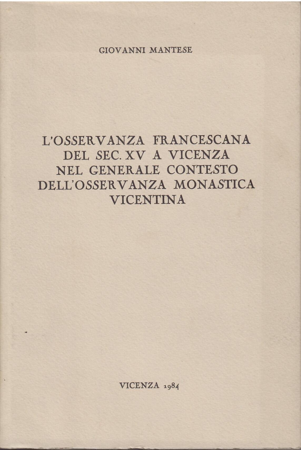 L'OSSERVANZA FRANCESCANA DEL SEC. XV A VICENZA NEL GENERALE CONTESTO DELL'OSSERVANZA MONASTICA VICENTINA | Livres anciens et modernes | Giovanni Mantese