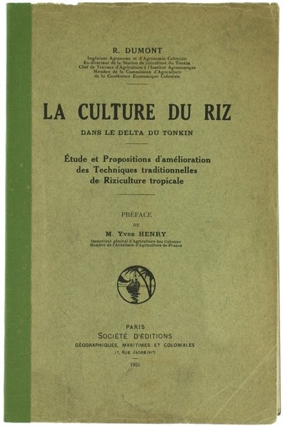 LA CULTURE DU RIZ DANS LE DELTA DU TONKIN. Étude et Propositions d'amélioration des Techniques traditionnelles de Riziculture tropicale. | Livres anciens et modernes | Dumont R.