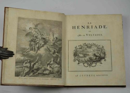Cm. 28, pp. (8) 10, 202. Grande vignetta al frontespizio, antiporta figurata, grandi testate, finalini e 10 belle tavole fuori testo, il tutto inciso in rame da Cochin. Tardieu, Dupuis e altri. Legatura coeva in piena pelle marrone, dorso con titoli su tassello e fregi in oro. Piatti inquadrati da filetti a secco. Ex libris nobiliare. Dorso ben restaurato. Esemplare genuino e ben conservato, Edizione in cui appare per la prima volta il titolo "La Henriade", di molto corretta rispetto all'originale del 1723 il quale portava il titolo: La ligue ou Henry Le Grand.". Si tratta inoltre della prima edizione figurata. Esemplare che contiene le pagine con l'elenco dei sottoscrittori presenti solo in alcune delle copie censite. Cfr. Cohen-Ricci, 1025 e Le Petit (p. 535): "Cette édition de luxe, la première qui porte le titre La Henriade, est aussi la première qui ait été corrigée avec soin et revue par Voltaire. Elle présente un texte parfois différent de celui de l’édition de 1723 et des suivantes, et partout ce texte est beaucoup plus correct. Cette belle édition peut donc etre considérée comme la prèmiere vraiment authentique.“. Edizione assai rara, da non confondersi con l’impressione (in-8) apparsa qualche settimana più tardi cui lo stesso Voltaire diede il permesso di stampa e che porta gli stessi dati tipografici ma nella quale non sono presenti le tavole.