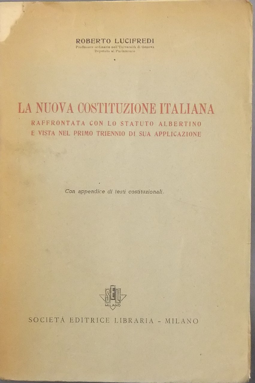 La nuova Costituzione italiana raffrontata con lo Statuto Albertino e vista nel primo triennio di sua applicazione. Con appendice di testi costituzionali | Livres anciens et modernes | Lucifredi Roberto (1909-1981)