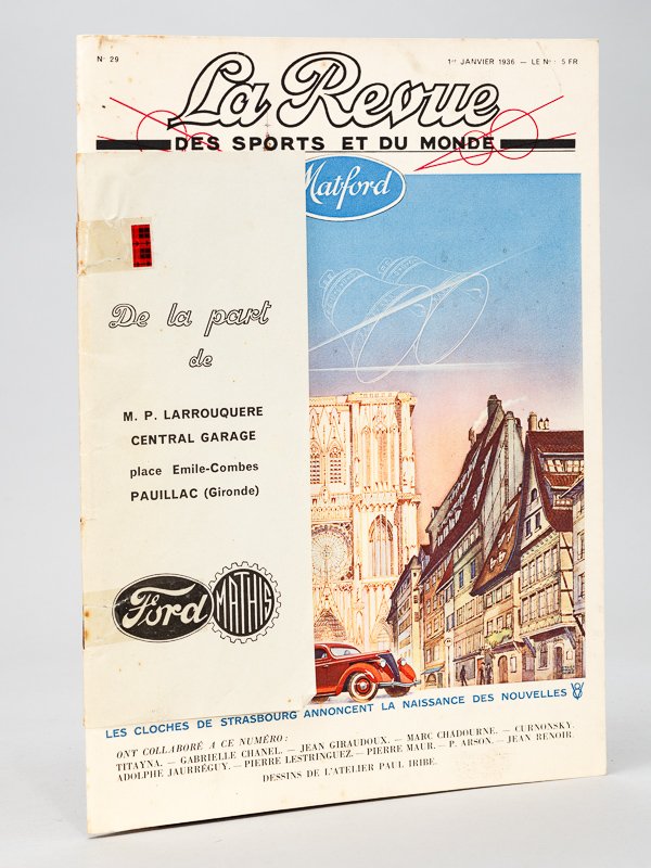 1 numéro in-4 br., La Revue des Sports et du Monde Matford. 1er Janvier 1936, n° 29, 41 pp. avec 4 ff. en couleurs Bon exemplaire de ce numéro historique de cette superbe revue publicitaire de la firme Matford, numéro spécial honorant la mémoire de son ancien directeur le grand illustrateur et publicitaire Paul Iribe. Constructeur d'automobiles français créé en 1934 suite à un accord entre Ford France et le constructeur alsacien Mathis, Matford développe le modèle Alsace V8 avec son moteur V8.