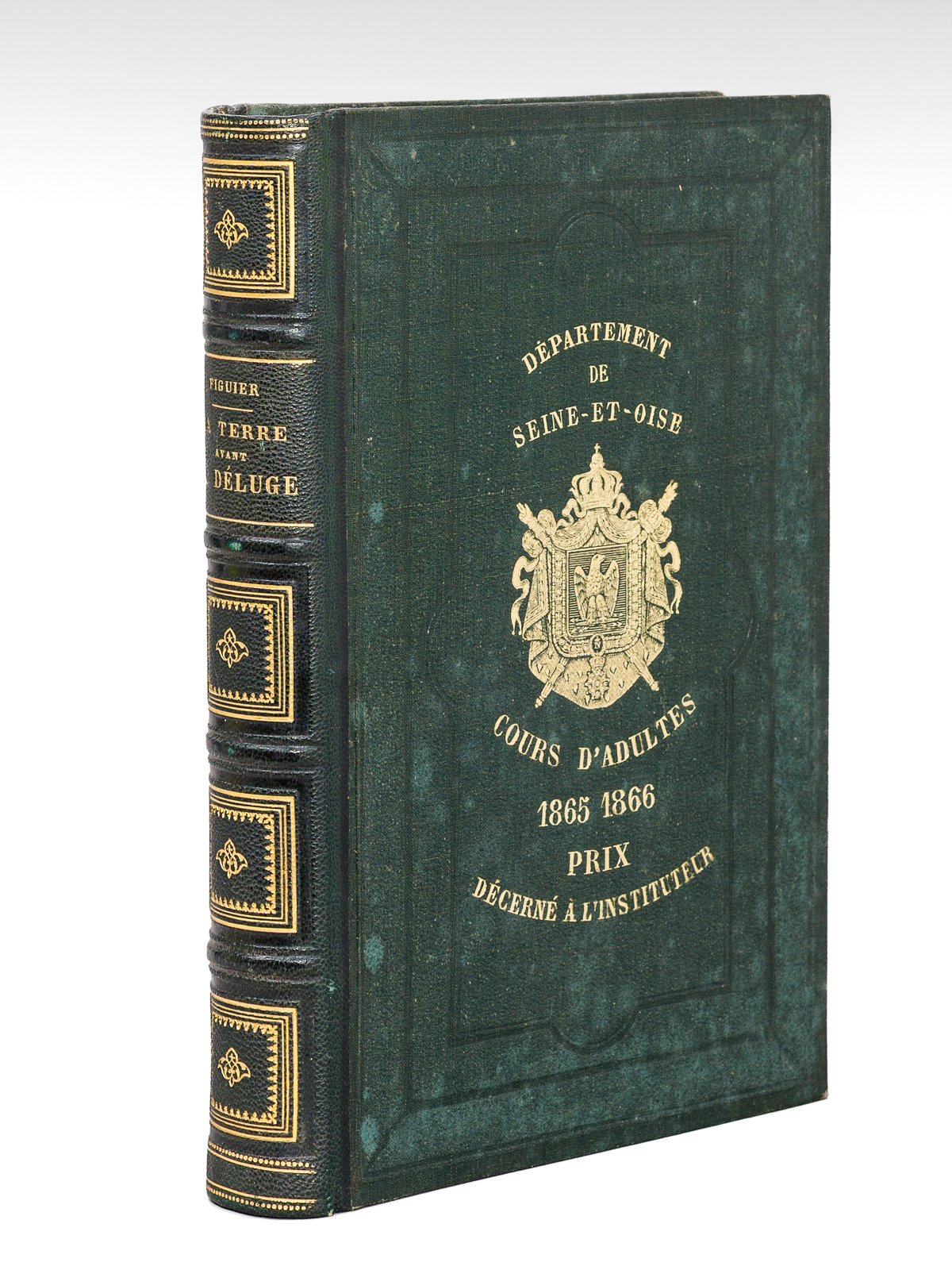 Cinquième édition, ouvrage contenant 25 vues idéales de paysages de l'ancien monde, dessinées par Riou, 322 autres figures et 8 cartes géologiques coloriées, 1 vol. in-8 reliure de l'époque demi-chagrin vert, dos à 4 nerfs ornés, fers de prix du Département de Seine-et-Oise, Cours d'Adulte 1865-1866 Prix décerné à l'Instituteur, Librairie de L. Hachette et Cie, Paris, 1866, 506 pp. Agréable exemplaire orné d'un très intéressant fer de prix (lég. anciennes traces d'humidité en plat, très bon état par ailleurs).