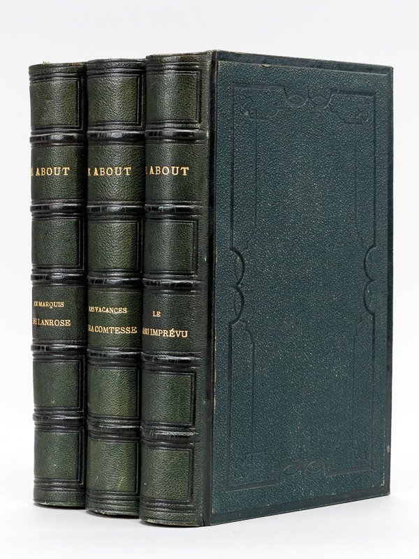 3 vol. in-8 reliure uniforme demi-chagrin vert, dos à 5 nerfs, toutes tranches dorées, Librairie de L. Hachette et Cie, Paris, 1865, 1865, 1866, 3 ff., 424 pp. et 2 ff. ; 2 ff., 495 pp. et 2 ff. ; 2 ff., 525 pp. et 1 f. Bel exemplaire très bien relié, en reliure uniforme, de l'édition originale, pour chacun des 3 volumes (qq. rouss., très bel état par ailleurs). Rédigée avec l'extraordinaire verve, coutumière à Edmond About, cette trilogie romanesque est tout autant une satire piquante qu'un vaste panorama de la France du Second Empire. Vicaire, I, 9