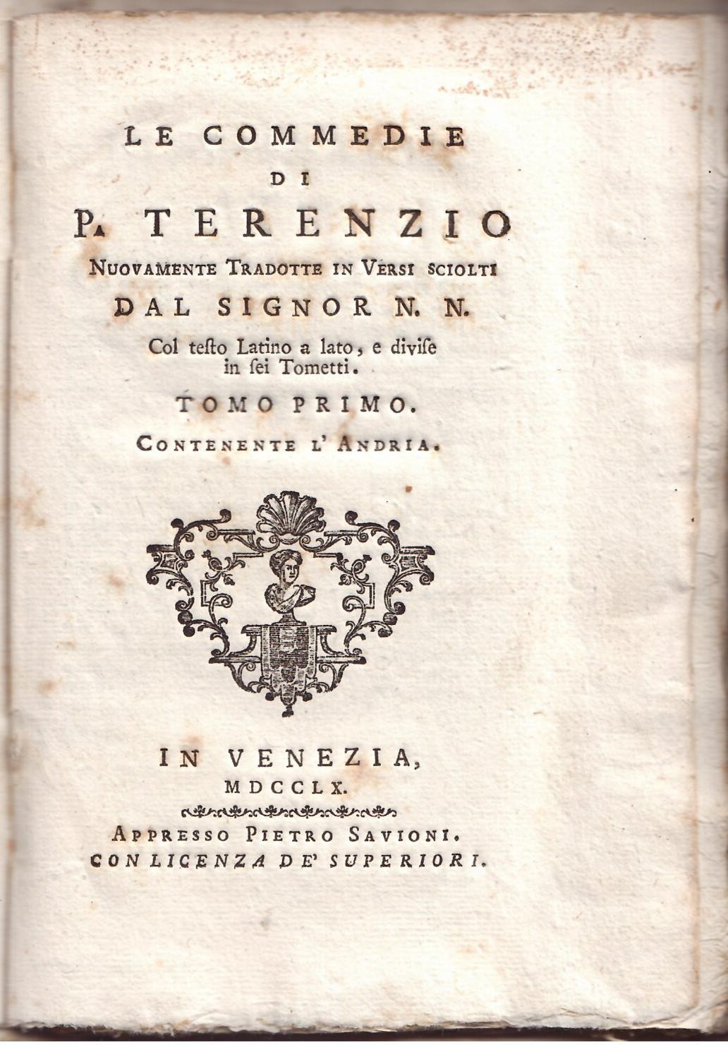 LE COMMEDIE DI P. TERENZIO NUOVAMENTE TRADOTTE IN VERSI SCIOLTI DAL SIGNOR N.N CON TESTO LATINO A LATO