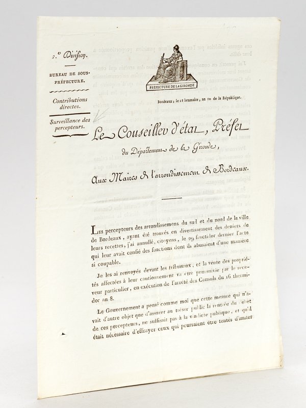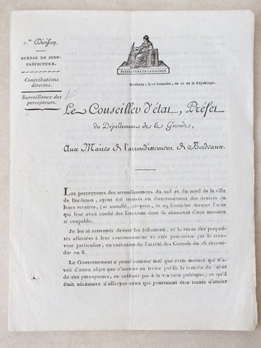 Le Conseiller d'Etat, Préfet du Département de la Gironde, aux Maires de l'arrondissement de Bordeaux. Bordeaux, le 28 Brumaire an 10 [ 19 novembre 1801 - Surveillance des Percepteurs poursuivis pour détournement ] "Les percepteurs des arrondissemens du sud et du nord de la ville de Bordeaux, ayant été trouvés en divertissement des deniers de leurs recettes, j'ai annullé, citoyens, le 29 fructidor dernier l'acte qui leur avait confié des fonctions dont ils abusaient d'une manière si coupable. Je les ai renvoyé devant les tribunaux. Le Gouvernement a pensé comme moi que cette mesure . ne suffisait pas à la vindicte publique, et qu'il était nécessaire d'effrayer ceux qui pourraient être tentés d'imiter ces agents infidèles par l'exemple d'une | Livres anciens et modernes | Dubois