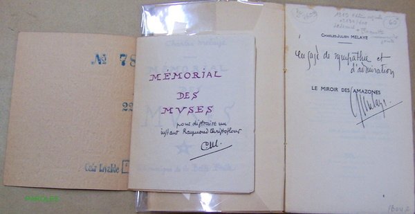 1feuillet, 167p. + 1 plaquette 10,7 x 13,8cm de 6 feuillets, agrafée sous couverture de papier peint. Bon état (bande de 3,8cm découpée en marge supérieure du faux-titre). Edition originale de ce recueil de pastiches poétiques de Charles MELAYE (1890-1954) ainsi dédicacé (dédicace imprimée): "ces fidèles reflets des muses guerrières sont dédiées à l'Ombre héroïque et charmante de Charles Muller mort pour la défense de l'esprit français" (Charles Müller, le célèbre pasticheur littéraire, est mort au front en 1914): "en marge de" Guillaume Apollinaire, Henry Bataille, Albert Bonnard, Dominique Bonnaud, Théodore Botrel, Maxime Brienne, Paul Claudel, Jean Cocteau, Georges Docquois, Paul Fort, Joachim Gasquet, Vincent Hyspa, Maurice Maeterlinck, Maurice Magre, Stuart Merrill, Jean Ott, Henri de Régnier, Jean Richepin, Jehan Rictus, Jules Romains, Edmond Rostand, Albert Samain, Comtesse de Noailles. Tirage à 600 exemplaires numérotés et paraphés par l'auteur: exemplaire justifié n°134, bien paraphé par l'auteur, comportant, en outre, une dédicace manuscrite d'icelui (nom du destinataire découpé), et enrichi d'une plaquette manuscrite intitulée "Mémorial des Muses", recueil de 12 quatrains, également dédicacée par l'auteur, à l'écrivain Raymond Christoflour. Broché.