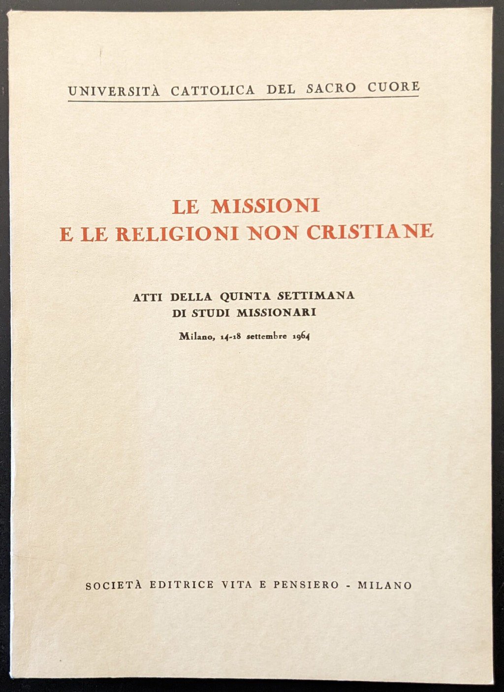 Libro vintage. Argomento: Spiritualità. Autore: n.d. Editore: Vita e Pensiero. Luogo: Milano. Anno: 1964. Formato: in-8°. Pagg: 259. Legatura: Brossura. Conservazione: buona. Atti della quinta settimana di studi missionari - Milano, 14-18 settembre 1964. Tagli lievemente ingialliti.