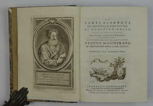 Cm. 24,5, pp. xx, 570. Con ritratto dell'autore all'antiporta, grande vignetta al frontespizio e 6 tavole d'illustrazioni fuori testo. Il tutto finemente inciso in rame. Solida ed elegante legatura ottocentesca in mezza pelle, dorso liscio con titoli e fregi in oro. Esemplare in eccellente stato di conservazione. Edizione assai stimata e considerata la migliore e più completa mai impressa di questo classico dell'agricoltura che vide la luce, in originale, nella metà del '500. Cfr. Ceresoli (p. 264): "Bellissima edizione, con le annotazioni di Cristoforo Pilati, a spese dell'Accademia di Brescia, con l'aggiunta sopra il frumentone altrimenti Gran Saraceno.".