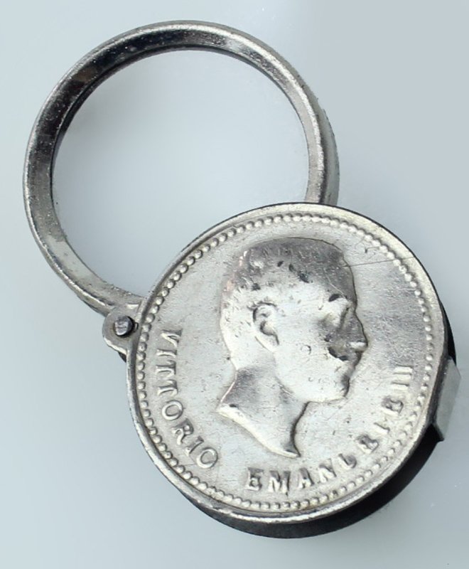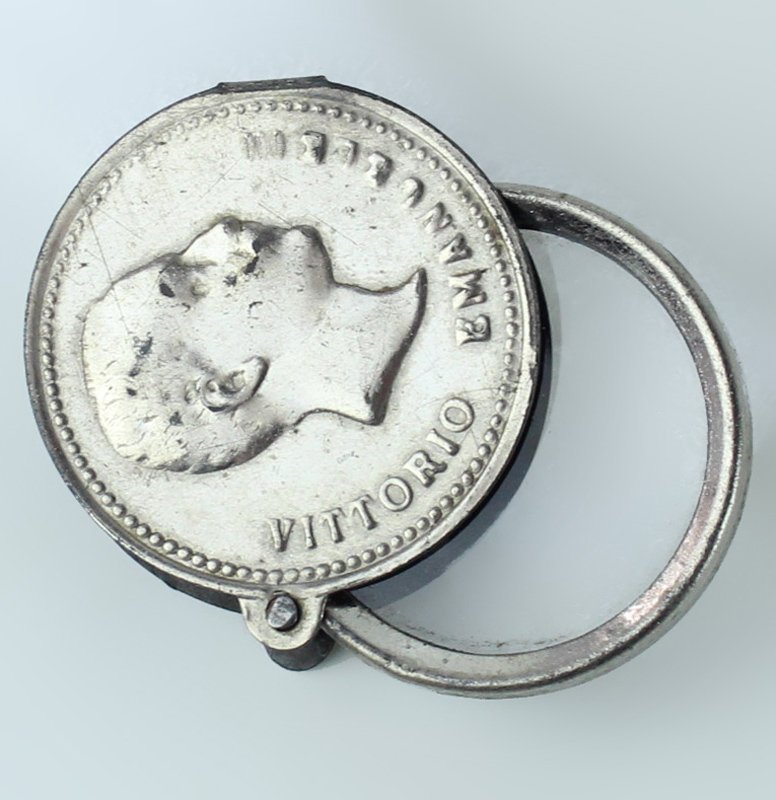 (Codice ZZ/0807) Lente da tasca, coperchio girevole in metallo con impresso il profilo e il nome di Vittorio Emanuele III. L'oggetto chiuso misura mm 34x7 circa ~~~ SPEDIZIONE IN ITALIA SEMPRE TRACCIATA