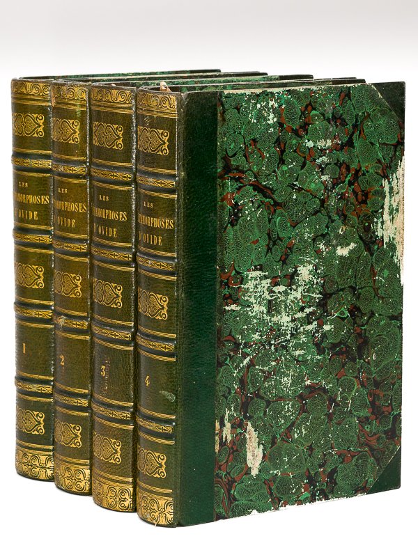 Nouvelle édition, revue, corrigée, le texte latin en regard, et ornée de 141 Estampes, gravées au burin sur les dessins des meilleurs peintres de l'Ecole française, Moreau le jeune et autres, 4 vol. in-8 reliure demi-maroquin vert, dos à 4 nerfs plats dorés richement orné, Chez Desray, De l'Imprimerie de Crapelet, Paris, 1808, LVI-320 pp. ; 2 ff., 400 pp. ; 2 ff., 424 pp. ; 2 ff., 427 pp. avec 141 planches hors texte Les 141 superbes gravures de cette magnifique édition sont bien présentes (il y a une planche bis et le frontispice n'est pas numéroté), mais les planches 5 à 8 ("le Printems" ; "l'Eté" ; "l'Automne" ; "l'Hiver") n'ont pas été reliés et sont conservées volantes. On remarquera également que la table du tome premier (pp. 321-323) a été reliée par erreur entre les pp. 422 et 423 du tome IV. Bon état (planches 5 à 8 volantes, petits accrocs en dos du tome 2, plats un peu frottés, sans le feuillet de placement des gravures, belle fraîcheur intérieure) pour cet exemplaire aux superbes gravures d'Eisen, Moreau le Jeune, etc.