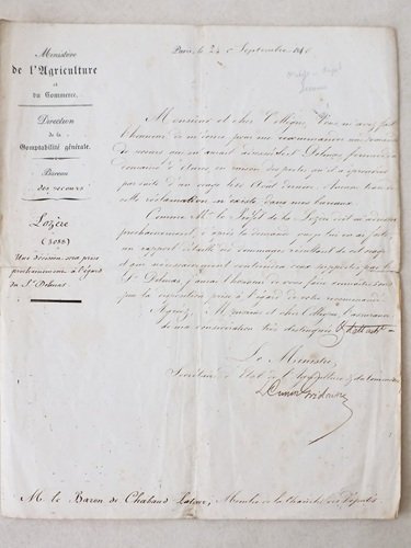 [ Lettre signée du Ministre Secrétaire d'Etat de l'Agriculture et du Commerce, adressée le 24 Septembre 1846, à M. le Baron de Chabaud Latour, Député de la Lozère ] "Monsieur et Cher Collègue, Vous m'avez fait l'honneur de m'écrire pour me recommander une demande de secours que m'aurait adressée le Sr. Delmas, fermier du domaine d'Aures, en raison des pertes qu'il a éprouvées par suite d'un orage le 10 Août dernier".